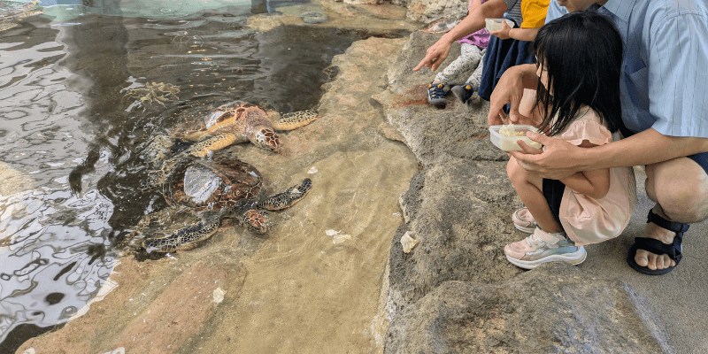 餌やり体験では、ウミガメが近くに来てくれるので、子どもたちは大興奮でした。
