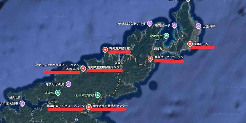今回ご紹介した施設は、空港から近い場所〜奄美中部の地域にすべてあります。