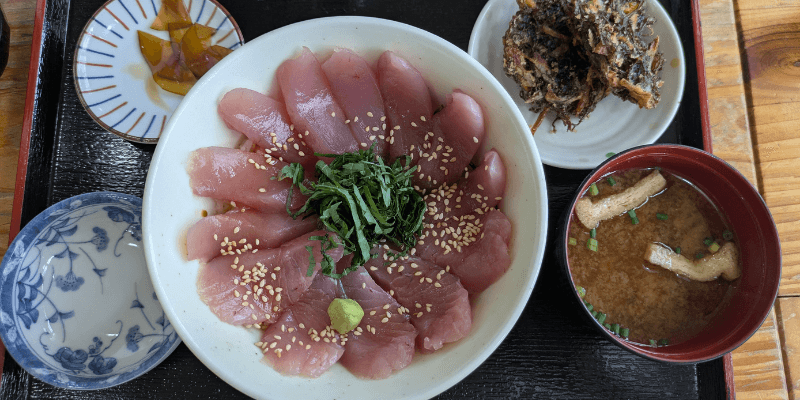 わたしが食べたのは奄美産マグロ丼!夫は地場産魚フライ定食を食べていました。
